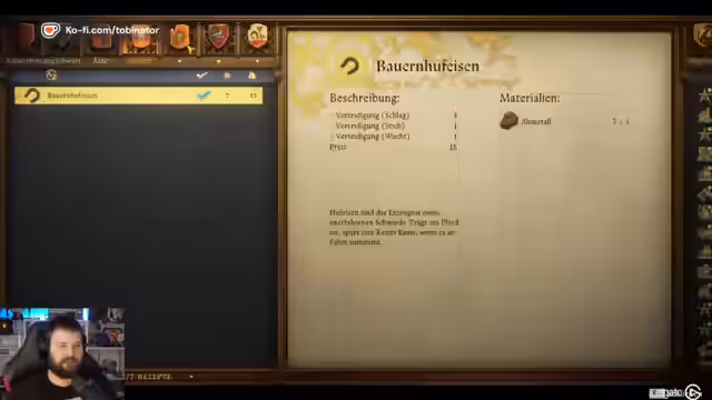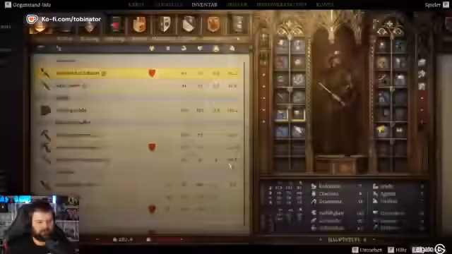 02:35:53Nach dem Schlafen entdeckt der Streamer hochwertige Ausrüstung aus der Gold Edition des Spiels, darunter Schilde und einen Hut des Heiligen Hubertus. Er verkauft einige Gegenstände an Radovan, hat aber nicht genug Geld für ein Pferd. Er beginnt weitere Gegenstände herzustellen und lernt neue Rezepte, wie Retterschnaps und Holzfälleraxt.