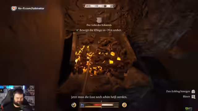 02:09:04Der Streamer erhält die Quest, die Axt aus dem See zu finden. Anschließend beginnt er mit der Hauptmission und betritt die Schmiede des Dorfes. Er lernt unter Anleitung von Schmied Radovan das Schmieden. Er schmiedet erfolgreich ein Jagdschwert, zeigt Talent im Handwerk und erhält Zugang zu einem eigenen Bett und einer Truhe im Dorf.