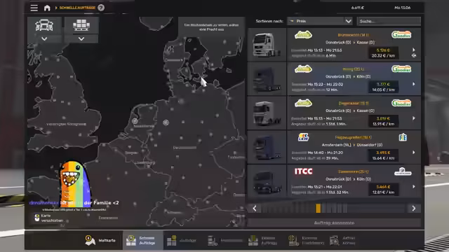 02:18:35Der Streamer startete eine neue Karriere im Euro Truck Simulator 2, was den eigentlichen Kern des Streams bildete. Nach der Anmeldung wählte er die einfache Automatik als Kontrolleinstellung und begann mit der Konfiguration seines Trucks. Die Wahl der Startstadt sorgte für eine lebhafte Diskussion im Chat, wobei Vorschläge wie Athen, Sassari, Barcelona, Marseille, Köken, Istanbul und Frankfurt fielen. Letztendlich entschied er sich für Amsterdam als Startpunkt. Für seinen ersten Job wählte er einen Scania-Truck, da dieser kürzlich überarbeitet wurde und er einen Truck fahren wollte, den er noch nicht oft benutzt hatte. Die Möglichkeit, einen Elektro-Truck zu fahren, wurde kurz in Betracht gezogen, aber für den ersten Job war dies noch nicht möglich. Er entschied sich schließlich für einen Iveco Stralis. Nach dem Start des Spiels musste der Streamer zunächst die Steuerung anpassen und den Motorsound des LKWs einpegeln, da dieser anfangs zu laut war. Er war begeistert vom Controller-Support des Spiels und der Tatsache, dass die Steam Cloud seine Spielstände problemlos synchronisiert hatte. Trotz kleinerer Anpassungen und der noch ausstehenden Installation seines Lenkrads zeigte er sich bereit für die erste Fahrt und freute sich auf die Herausforderungen des Euro Truck Simulator 2. Die erste Fahrt begann mit der Flur GmbH als Firmennamen und dem Ziel, schnelle Aufträge zu erledigen, auch wenn er noch keinen eigenen Auflieger besaß.