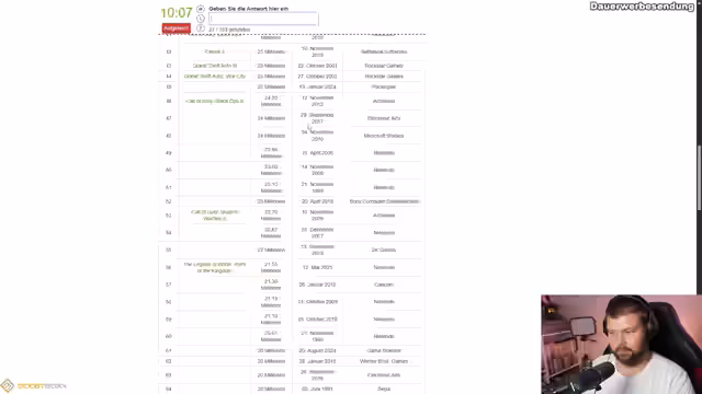 01:57:30Der Streamer startet ein Quiz von Ulti über die 103 meistverkauften Videospiele und versucht, innerhalb von 17 Minuten so viele Titel wie möglich zu erraten. Zu den genannten Spielen gehören Minecraft, Grand Theft Auto 5, Super Mario Bros., PUBG, GTA San Andreas, Zelda Breath of the Wild, Zelda Tears of the Kingdom, Animal Crossing, The Elder Scrolls Skyrim, Far Cry 3, Assassin's Creed 2, Diablo 3, Sims und Wii Sports. Es folgen weitere Titel wie FIFA, L.A. Noire, Red Dead Redemption 2, Super Mario Odyssey, GTA 4, Pokémon Schwert, Call of Duty Black Ops und Fallout 4. Einige erfolgreiche Spiele wie Half-Life 2 und Final Fantasy 7 fehlen überraschenderweise in der Liste. Trotzdem wird das Quiz als lustig empfunden. Nach dem Quiz kündigt der Streamer eine Hundie-Pause an.