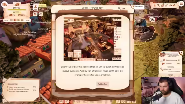 03:19:44Der Streamer äußert den Wunsch, das Spiel weiterzuspielen und es durchzuziehen. Er vergleicht es positiv mit Ghost of Tsushima. Anschließend wechselt er zu Town to City. Er fragt die Zuschauer, ob sie im Steam Sale etwas gekauft haben und bedankt sich bei Supportern für Subs und Geschenke. Er erwähnt, dass er DLCs für Planet Zoo gekauft hat. In Town to City ersetzt er Holzbänke durch Metallbänke und schaltet ein Bistro frei. Er platziert Häuser und versucht, die Bedürfnisse der Bürger zu erfüllen, indem er Dekorationen und Freizeiteinrichtungen hinzufügt. Er baut eine breite Straße, um die Transportkosten zu senken. Die Bürger sind jedoch unzufrieden, und der Streamer versucht herauszufinden, warum. Er vermutet, dass es an der Arbeitslosigkeit oder dem Straßen-Upgrade liegt. Er baut eine Lagerhalle und versucht, das Bistro zu beliefern, aber es gibt Probleme mit den Verbindungen. Der Streamer experimentiert mit Dekorationen und versucht, die Stadt glücklicher zu machen, indem er Bänke und Blumen platziert.