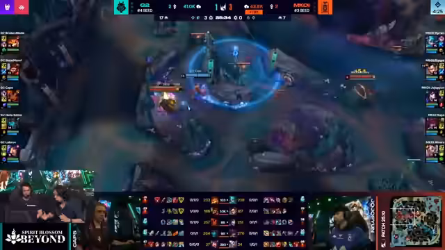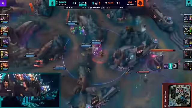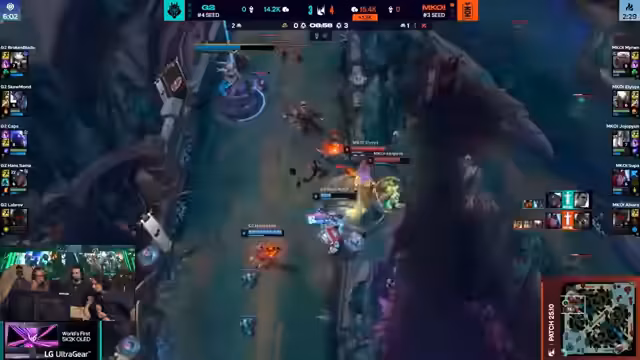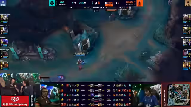 09:40:37Nach dem Drachenverlust hat G2 die Initiative und entscheidet, den Baron Nashor anzugreifen. G2 hat dabei einen Goldvorteil. Mervyn nutzt sein Hextech-Gate, um einen Nutzen zu generieren, und verhindert einen direkten Angriff. Trotzdem ist das Engagement zu langsam, und Movistar Rivers kämpft sich ins Teamfight hinein. G2 gewinnt den Fight knapp und nimmt den Baron. Der Analyst kritisiert jedoch stark, dass G2 den Vorteil durch den nicht richtig umsetzt: sie holen kaum Türme oder eine Welle und geben dem Gegner somit eine wichtige Pause.