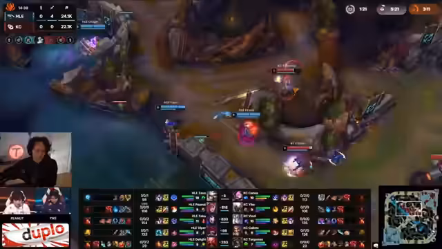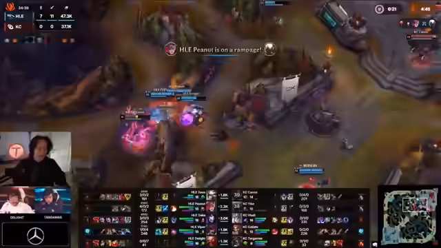 03:39:16Der Spielaufbau verläuft für KC zunächst erfolgreich. Sie kontrolliert die Raptoren und nutzt die Map-Control, um Draven zu farmen und Botlane-Priorität zu sichern. Die Rotationen sind strategisch klug, und auch nach einem Todesfall von Cannon an Top-Lane bleibt das Team im Spiel. Ein kritischer Fehler von Kanavi bei der Verteidigung des Camps führt jedoch zu einem erheblichen Nachteil, da es Ari die Möglichkeit gibt, Draven zu isolieren. Das Spiel wird durch Teleport-Vorteile des Gegners und die Stärke von Ari auf Draven geprägt. Trotzdem bleibt KC im Spiel, da Draven seine Rolle erfüllt und das Teamfight-Potenzial besteht, sobald alle wichtigen Items wie Hollow Radiance fertig sind.