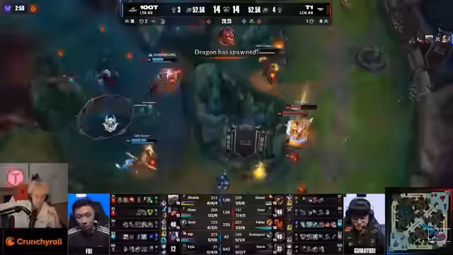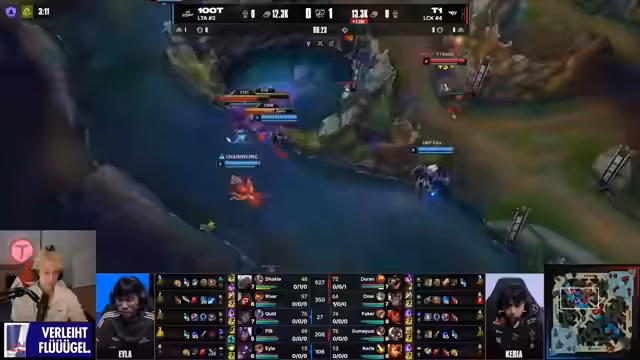 09:49:25Trotz T1's anfänglicher Dominanz kommt es zu unerwarteten Wendungen. Faker stirbt in der Mid-Lane, und auch Doran wird getötet, was den 100 Thieves einen Vorteil verschafft. Die 100 Thieves, die eine extrem harte Schedule hatten, gewinnen das Early Game mit 6 zu 2 Kills und sichern sich Platten auf der Bot-Lane. Sie töten Faker und Doran erneut, was Sylas mit vier Dark Seal Stacks sehr mächtig macht. Obwohl T1 im Mid-Game einen Spike erwartet, zeigen sich die 100 Thieves keineswegs schwach. Es wird die Frage aufgeworfen, ob T1 zum ersten Mal in 15 Jahren vor dem Halbfinale von einem amerikanischen Team eliminiert werden könnte, was als 'crazy' bezeichnet wird. Trotz einiger Rückschläge für T1, wie dem Verlust des Drachens, bleibt das Gold fast ausgeglichen, und die 100 Thieves zeigen eine starke Leistung, insbesondere durch Quid, der aus der Flanke smurft und Keria solo tötet.