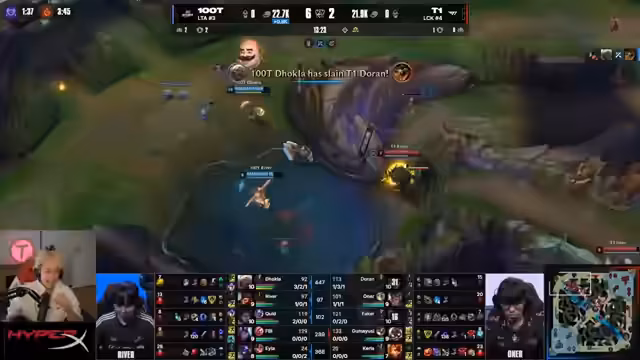 10:01:09Felker konzentriert sich darauf, Goomba zu schützen, während Doran stirbt. Die HP-Balken sind auf beiden Seiten niedrig, und Redemption bringt etwas Heilung. Ouna springt vorwärts und zurück, während Felkers Combo den Affenkönig trifft. Der Drache geht an Ouna, der Quad jagt. Ein wichtiger Zeitzug gegen Sylas' Ketten rettet Ouna beinahe, doch er wird gesnipet, was zu einem Double-Kill für Corki und einem Shutdown für FBI führt. Felker jagt FBI ohne Flash, während Fakers Slows verhindern, dass jemand entkommen kann. Thalia erweist sich als entscheidender Champion für T1. Faker wird gejagt und überlebt knapp. Die Diebe nutzen einen Fehler von T1 aus, indem sie den Blue Buff invaden und Ouna töten, um Nashor auf Spawn zu sichern. Dies führt zu einem erheblichen Goldverlust für T1, da sie den Nashor zu einem frühen Zeitpunkt verlieren. T1 wird für ihre Zögerlichkeit bestraft, während die 100 Thieves ihren Vorteil ausbauen.