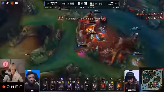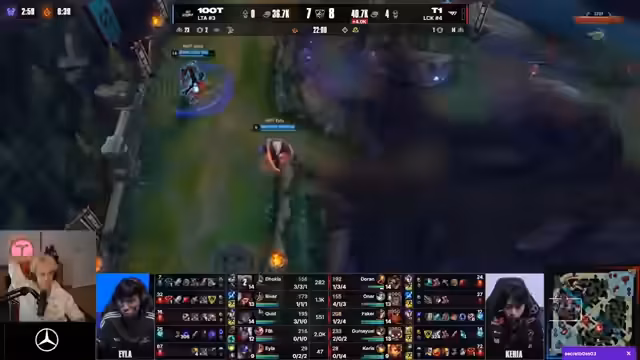 03:15:01100 Thieves, mit einem schweren Spielplan gegen LPL- und LCK-Teams, zeigen ein starkes Early Game und erzielen eine 6-zu-2-Kill-Führung. Sie sichern Platten auf der Bot-Lane und töten Faker auf der Top-Lane erneut. Trotz T1s besserem zweiten Power-Spike sind 100 Thieves mit zwei Items keineswegs schwach. Faker stirbt erneut in einem unglücklichen Moment, als er versucht, Flammen zu sammeln und über eine Wand flasht. Die Diskussion über Fakers Spielweise und die Stärke von Renekton sowie die Bedeutung von Wave-Management und Objective-Kontrolle prägen das Spielgeschehen. T1 steht unter Druck, da 100 Thieves das Gold wieder fast ausgleichen und den ersten Bot-Lane-Turm einreißen. Die Möglichkeit eines historischen Upsets durch 100 Thieves gegen T1, den Rekordmeister, wird immer realer.