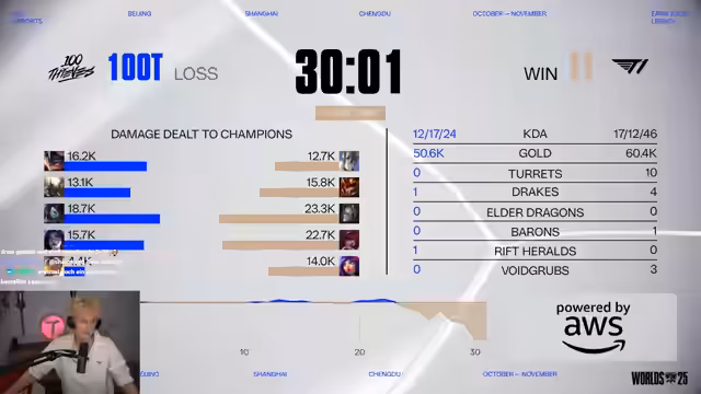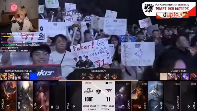 11:02:41T1 dominiert weiterhin die Teamfights, sichert sich weitere Kills und ist am Ende des Spiels deutlich überlegen. Faker auf Oriana ist Level 16 und somit komplett outscaled, während Dorans Galio ebenfalls glänzt. Die Diebe haben ihr enges Zeitfenster und ihre Win-Condition nicht genutzt, was zum Verlust des Spiels führt. Nach dem Spiel wird die Drawshow für die nächsten Runden der Worlds angekündigt. Es wird diskutiert, welche Teams gegeneinander antreten können, wobei bestimmte Rematches und Paarungen ausgeschlossen sind. Die Verabschiedung von 100 Thieves aus dem E-Sport wird emotional thematisiert, da sie sich als Organisation auflösen. Trotz der Niederlage wird Quid für seine aggressive Spielweise und seinen Kampfgeist gewürdigt.