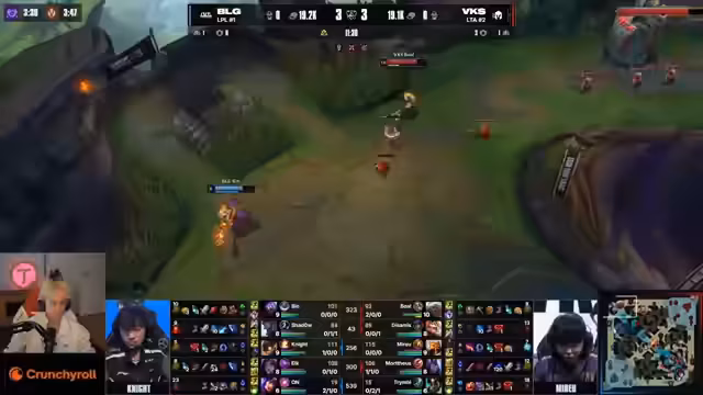 02:33:28Ein schwerwiegender Fehler von On führt zum Tod von Knight, was Brasilien eine riesige Chance zum Sieg bietet. BLG greift mit fünf Spielern die Midlane an, doch die brasilianische Verteidigung hält stand. In einem chaotischen Finale gelingt es Bin von BLG, einen Backdoor-Angriff auf den Nexus zu starten, während Mirio versucht, ihn zu stoppen, aber stirbt. Dieses unerwartete Ende sichert BLG den Sieg, trotz zahlreicher Stolpersteine und schlechter Entscheidungen während des Spiels. Der Backdoor von Bin wird als entscheidender Moment gefeiert, der das Team vor einer möglichen Niederlage bewahrt. Brasilien scheidet damit aus den Worlds aus, während BLG mit 2:2 weiterkommt.