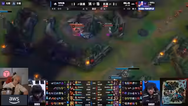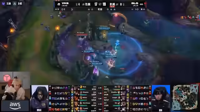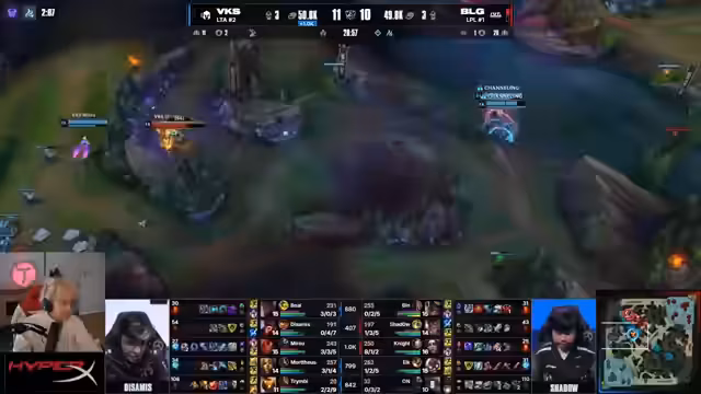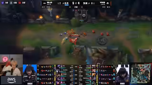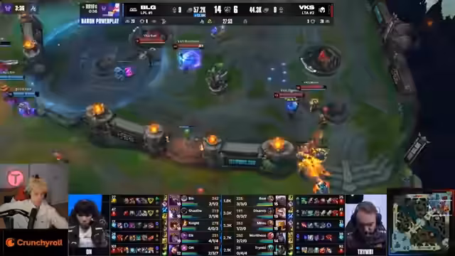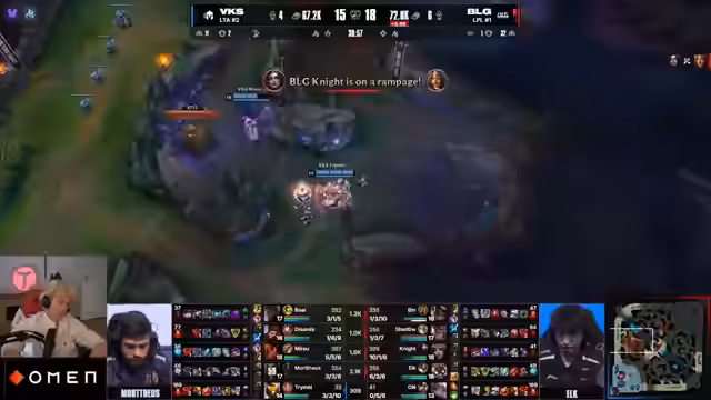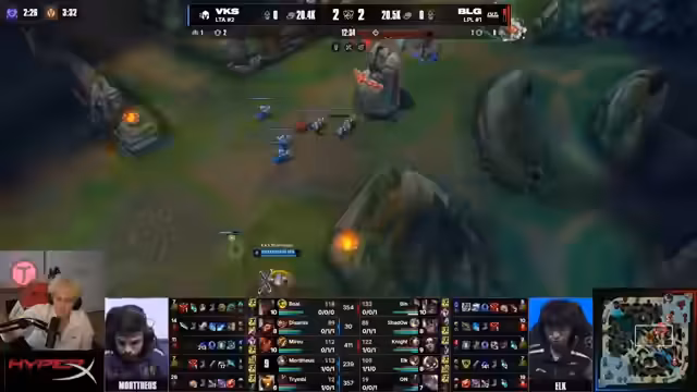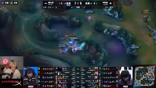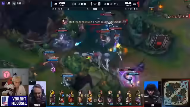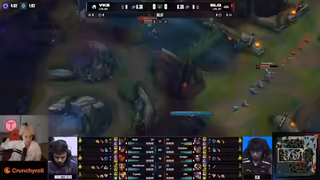 07:55:35Das Spiel zeigt eine klare Dominanz von BLG, obwohl ihre Leistung nicht als überragend beschrieben wird. Die Draft-Strategie von VKS mit Karma und Varus wird als unzureichend kritisiert, da sie im Early Game nicht genug Druck aufbauen konnte und ein Golddefizit von 2.500 Gold aufwies, was als „terrible“ bezeichnet wird. Die Namen der Spieler von BLG, wie Bin, Shadow, Night, Egg und On, werden als überlegen gegenüber denen von VKS (Bull, Desamis, Mirio, Mortius, Trimby) hervorgehoben. Es wird erwartet, dass BLG in Teamfights aufgrund ihrer Komposition und individuellen Fähigkeiten überlegen sein wird. Trotz eines frühen Fehlers von BLG, der zu einem „brachialen Slung“ führte, konnten sie das Spiel drehen und dominieren. Besonders Knight mit seinem Six-Counterpick gegen Azir wird gelobt, da er einen Goldvorteil von 2.000 Gold erzielen konnte. Die Fähigkeit von BLG, sich nach einem schlechten Start zu erholen und die Kontrolle zu übernehmen, wird als „well played“ vom Vizemeister bezeichnet.