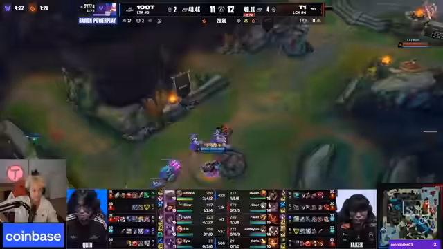03:21:53T1 kämpft um Objectives, während 100 Thieves versucht, ihre Türme zu verteidigen. Trotz T1s guter Vision auf der Top-Side gelingt es 100 Thieves, den Mid- und Top-Turm zu halten. T1 startet den Baron Nashor, aber 100 Thieves ist nicht in Reichweite. Faker setzt seine Ulti ein, aber 50-50 geht erneut an den Gegner. River stirbt an Faker, und obwohl T1 den Fight gewinnt, verlieren sie den Baron. Trotzdem erzielen sie drei Kills, was den Verlust des Barons etwas ausgleicht. Die Diskussion über Renektons Item-Build und Fakers Positioning zeigt die taktischen Feinheiten des Spiels. 100 Thieves gelingt es, den Baron Nashor zu stehlen, nachdem sie den Blue Buff invadiert und T1s Spieler getötet haben. Dies ist ein entscheidender Moment, da T1s wiederholte Base-Cancels bestraft werden und 100 Thieves einen großen Vorteil erlangen.
