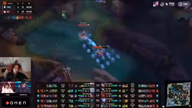 02:20:40Das Spiel beginnt mit einem aggressiven Early Game von K-Corp. Die Bot-Lane versucht, durch aggressive Drückungen und Ganks einen Vorteil zu erzielen. K-Corp gewinnt einen entscheidenden 4-0 Trade bei der großen Krabbe, was ihnen einen Goldvorteil und viel Selbstvertrauen für den Rest des Spiels verschafft. Kommentare über die mangelnde Kommunikation bei Top Esports sind ebenfalls präsent.