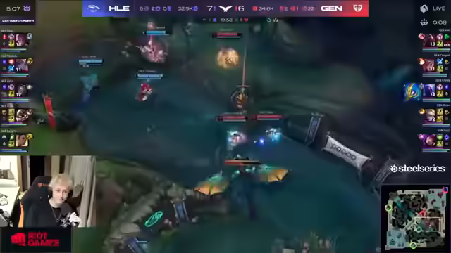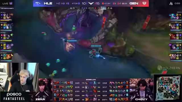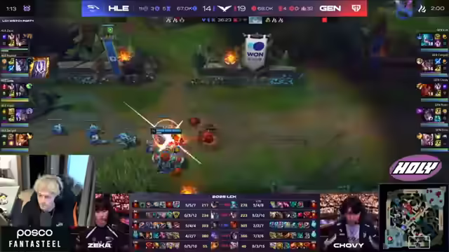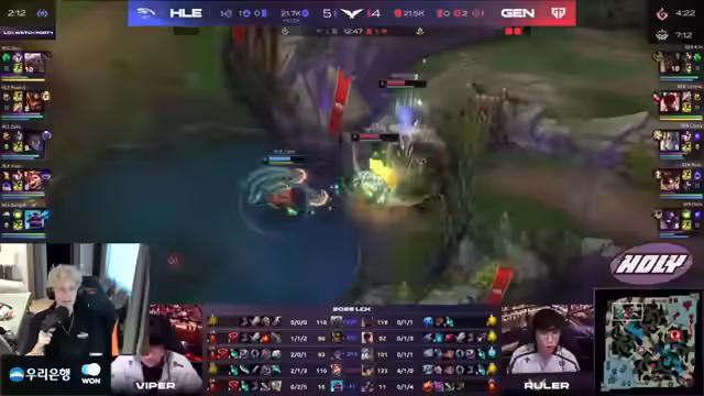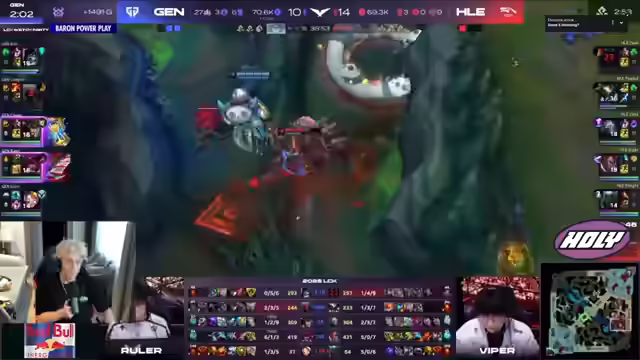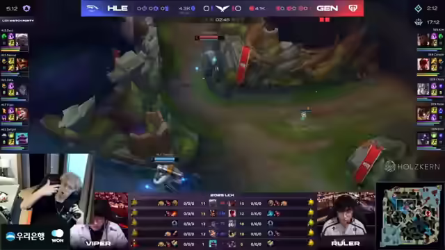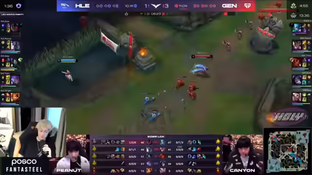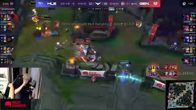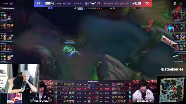 01:01:34HLE hat ein Problem, da Korki nicht für Trifoss basen kann, da er 200 Gold hinten liegt. Gen.G startet den Drake und HLE will contesten, kann aber nicht gegen Ezreal gewinnen. Ruler macht sehr viel Schaden und Peanut stirbt. Der Drake-Fight geht eindeutig an Ruler. Zeus flasht raus und der Drake wird von Ruler gelastet. Der Ezreal macht einen Unterschied. Gen.G reitet das gut aus, da das Gold auf Ezreal liegt. Ruler steht über der Wand und wartet auf Engages. Peanut misst da, dass er holt. Elsevier kann die gesamte Zeit Q-Alt Attack spammen. HLE hätte nicht feiten sollen, da sie wussten, dass Elsevier Triposter und Base hat. Es kommt zu einem bitteren Fight für HLE. Peanut gankt alle Lanes und bringt seine Charis nach vorne, aber sie spiken trotzdem später. Ruler wird engaged und Viper wird gesolo-killt. Ruler sagt selbst über sich, dass dann McKay's nicht mehr die Beste sind, er selbst ein Sly Old Fox. Ruler kehrt zurück und wird zum Team-Captain ernannt. Er hält alle Interviews als Team-Captain. Immer wieder ist es Ruler, der das Team zu erfolgen carriert. Oben 1 für 1 ist komplett fein aus Sicht von HLE. Aber für Ruler ist trotzdem ein Solo-Kill drin.