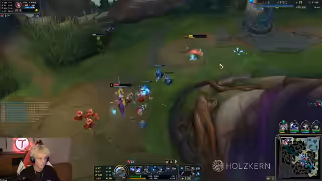 01:55:50Im späten Stadium des Spiels zeigt sich der Streamer resigniert. Er erkennt an, dass das Spiel nicht mehr gewonnen werden kann, und versucht stattdessen, Zeit zu schinden. Er kritisiert die Entscheidung seines Teams, weiterhin kämpfen zu wollen, obwohl es keine realistische Chance mehr gibt. Der Streamer beschreibt, wie er das Spiel mit einem Gefühl der Niederlage und Frustration beendet, während er über mögliche zukünftige Spiele und den mentalen Abbau durch League of Legends nachdenkt.
