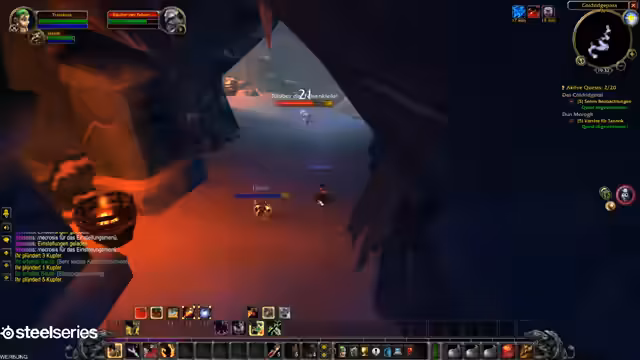 02:52:49Nachdem er die Höhle verlässt, liefert er Malzbier und Donnerbier ab, erhält aber keine Quest-XP. Ein NPC (Herr Donnerboy) läuft weg, was den Streamer frustriert – er gibt die Quest auf und sucht neue Questgeber. Später kauft er Erste Hilfe für 5 Silber und diskutiert, ob er Ingenieur ausbauen oder Schneiderei lernen soll, um Taschen selbst herzustellen.
