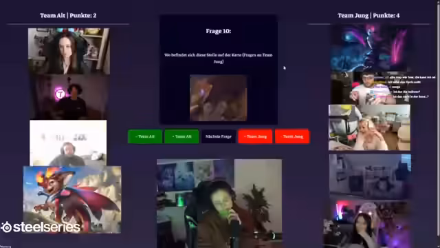 04:56:53Team Jung wird gefragt, wem ein bestimmter Tweet gehört. Es wird diskutiert, ob der Tweet von Franzi oder Tolkien sein könnte. Team Jung entscheidet sich für Tolkien, liegt aber falsch. Team Alt wird gefragt, wem ein anderer Tweet gehört. Es wird überlegt, ob der Tweet von Sarah oder Ginny sein könnte. Team Alt entscheidet sich für Sarah, liegt aber falsch. Es folgt eine Frage an beide Teams, wie viele Regionen es im League-Universum gibt. Team Alt schätzt 12, während Team Jung 13 sagt. Die korrekte Antwort ist 13. Es folgt eine Frage an Team Jung, wo sich eine bestimmte Stelle auf der Karte befindet. Nach einigem Hin und Her entscheidet sich das Team für die Golems auf der Top-Seite und bekommt den Punkt. Team Alt bekommt die gleiche Frage und antwortet korrekt mit der Position in der Nähe des Drachen.