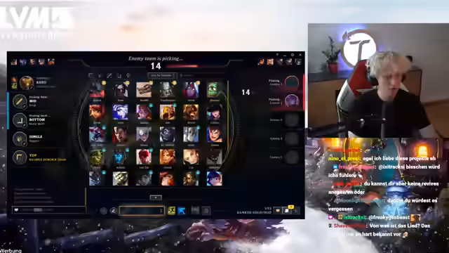 04:13:22Nach dem Streams kündigt der Streamer eine neue League of Legends Challenge an: die 'Darkin Challenge'. Ähnlich der Ionia Challenge besteht das Ziel darin, mit einer Auswahl an Darkin-Champions so hohe Kills wie möglich zu erzielen, wobei die Champions bei einer Niederlage sterben können. Nach drei Siegen in Folge kann ein Champion wiederbelebt werden. Die Champions beinhalten Aatrox, Nafiri, Varus, Thresh, Garen, Jax und Trundle.