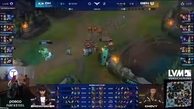03:14:22Das Spiel beginnt mit dem Fokus auf die Mid-Lane zwischen Showmakers Vladimir und Chovys Aurora. Showmaker nutzt seine historische Überlegenheit in diesem Match-up, um aggressiv zu handeln und einen Vorteil zu erzielen. Gleichzeitig wird die Top-Lane zwischen Raxxer und Kein analysiert, wobei Rek'Sai als stark geltend und Arthrox als nutlos beschrieben wird. Canyon, der auf Rek'Sai spielt, zeigt eine dominante Performance in der Jungle und im Drachen-Contest, was zu einem frühen Goldvorteil für Gen.G führt. Die Kommentare heben die Präsenz und das Engagement von Canyon hervor, das den Grundstein für den Sieg im Game legt.