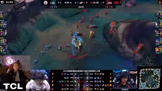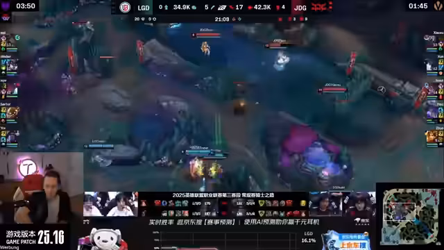 02:12:15JDG zeigt im dritten Spiel eine stabile und dominante Performance. Nachdem sie bereits den Herald gesichert haben, starten sie einen Teamfight an der Baron-Lane. Aurora und Jax bringen ihre Ultimative ein und eliminieren die Gegner erfolgreich. Der Weg zum Turm wird freigemacht und Scout kann einen Turm holen. Das Spiel endet mit einer klaren Niederlage für LGD, was die Serie auf 3:0 und den Einzug von JDG in die Playoffs besiegelt.