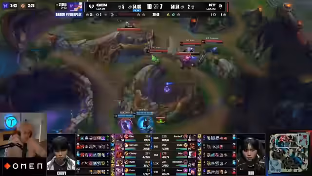 09:47:34Trotz des Rückschlags zeigt KT Anzeichen eines Comebacks, insbesondere durch Kate, die im Late Game mehr Schaden als Corki verursacht und kurz vor ihrem finalen Item steht. Ruler und Jovi sind ebenfalls gut ausgerüstet. Gen.G. führt zwar mit 6.000 Gold, hat aber bereits einen ähnlichen Vorsprung in einem früheren Kampf verloren. KT konzentriert sich darauf, die Nexus-Türme zu verteidigen und die Midlane zu halten, während Gen.G. versucht, die Belagerung fortzusetzen. Die Diskussion über die Effizienz von Tank-Items im Late Game gegenüber Damage-Items wird angestoßen, wobei Randuin's Omen als Beispiel für ein starkes Item genannt wird. Ein Engage von Peter führt zu hohem Schaden an Keane, was die Stärke von Caitlyn im Late Game unterstreicht. KT versucht, den Turm nicht aufzugeben und reagiert mit einem Flash von Tobi auf einen Engage, der jedoch nicht ausreicht, um Caitlyn zu entkommen. Dokdam sichert einen Double Kill und seine Caitlyn wird als „insane“ beschrieben.