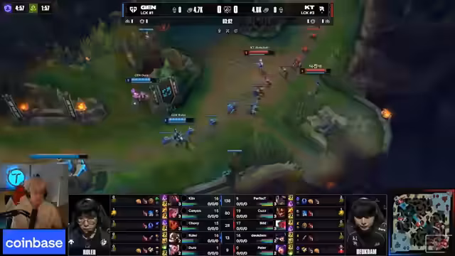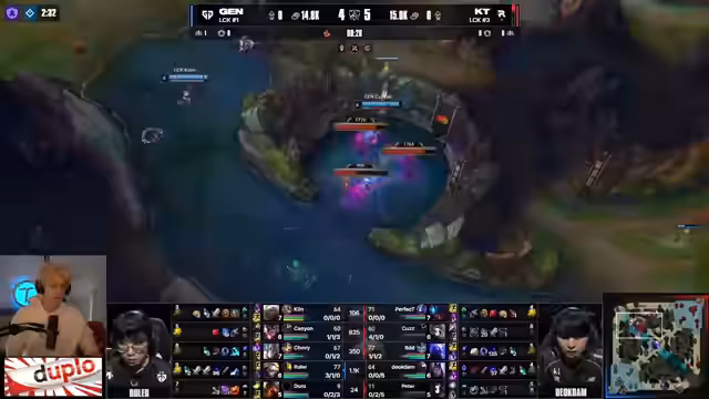 02:31:58Ein chaotischer Teamfight entbrennt, in dem Keane gejagt und von einem Flash von Keane angegriffen wird. Kass verfehlt seine Ult auf Rulac, was ihn fast das Leben kostet. Rulac überlebt knapp und wird von Peter angeflasht, stirbt aber letztendlich. Chovi und Dokdam liefern sich ein Duell, bei dem Dokdam mit einem HP überlebt, bevor er doch stirbt. Der Kampf endet in einem 4-zu-4-Trade, der für KT vorteilhaft ist, da sie den Drake sichern konnten. Allerdings konnten sie ihren Powerspike nicht eindeutig nutzen, was das Spiel extrem ausgeglichen hält. Besonders hervorzuheben ist das Desaster von Kiana, deren Ult im Fluss komplett danebengeht. Dieses mechanische Missplay darf auf diesem Niveau nicht passieren, da Kiana in Korea aufgrund solcher Fehler einen schlechten Ruf hat. Die Frustration ist bei Kiana deutlich sichtbar, da ein erfolgreicher Play in diesem Moment den Kampf für KT entschieden hätte. Trotz ihres 2,5-Item-Spikes kann Kiana ihre Stärke nicht ausspielen, was auf mechanische Defizite und die Schwierigkeit des Champions in chaotischen Situationen hindeutet. Dokdam hingegen verursacht viel Schaden, insbesondere gegen die HP-reichen Tanks von Gen.G, was die Notwendigkeit unterstreicht, dass KT mehr Schaden leisten muss, um Kills zu erzielen.