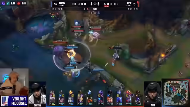 09:24:02KTs Laning-Phase entwickelt sich gut, insbesondere mit Yone gegen Sion, der nur Magieresistenz hat. Keen von KT zeigt eine starke Leistung auf Sion. Gen.G. erzielt jedoch durch effektive Engages von Wei, der zweimal mit Point-Click-Ultimativen Kills gegen die Bot-Lane von KT sichert, einen deutlichen Vorteil. Diese Kills führen zum Verlust eines Heralds für KT. Die Diskussion hebt hervor, dass Gen.G. trotz eines frühen Kills gegen Chovy und verlorenen Drachen im Mid-Game stark zurückkommt und ihre LCK-typische Spielweise zeigt. Die Synergie zwischen Canyon und Duro bei den Engages wird gelobt, da sie präzise und effektiv die Backline von KT treffen. KT verliert durch schlechte Positionierung wichtige defensive Ressourcen wie Flash, was ihre Situation weiter erschwert.