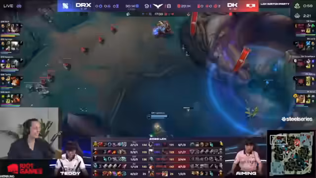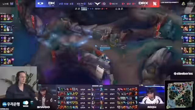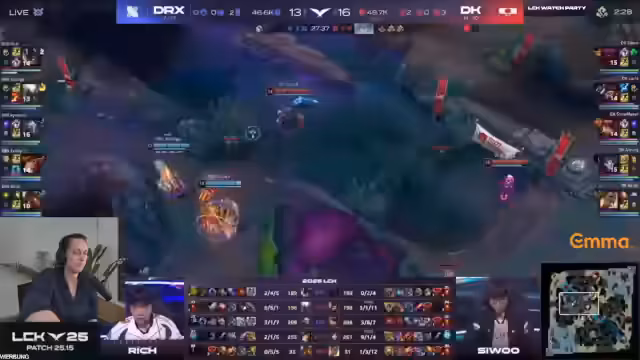 02:28:21Das erste Spiel wird als 'eine Achterbahn der Gefühle' beschrieben. Nach einem sehr starken Start von DRX mit einer 3-0 Führung für Sivir und klarem Goldvorteil, wirft das Team das Game durch einen fatalen Teamfight weg. Eine risikorente Rise-Ultimation wird von der Oriana von Damwon mit einer Shockwave-Kombo perfekt beantwortet, die einen klaren 5-1 Fight für Damwon zur Folge hat. Das Spiel endet letztendlich mit einem Nexus Push von Damwon, nachdem DRX den entscheidenden Fight verloren hat, und zeigt, wie schnell sich die Spielanteile in der LCK drehen können.