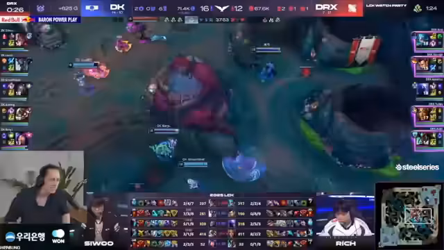 01:58:46Nach einem desaströsen Teamfight, den Damwon auf der Bot-Lane verliert, erleidet das Team massive Verluste auf allen三条 Lanes. Sie verlieren Ryze in der Mid-Lane und Top-Lane gleichzeitig, was es DRX ermöglicht, das Spiel kontrollieren. Trotzdem erzielt Damwon einen wichtigen Drachen. Der Streamer empfindet die Situation als sehr bitter für Damwon und sieht DRX durch den großen Goldvorteil nun klar im Vorteil.