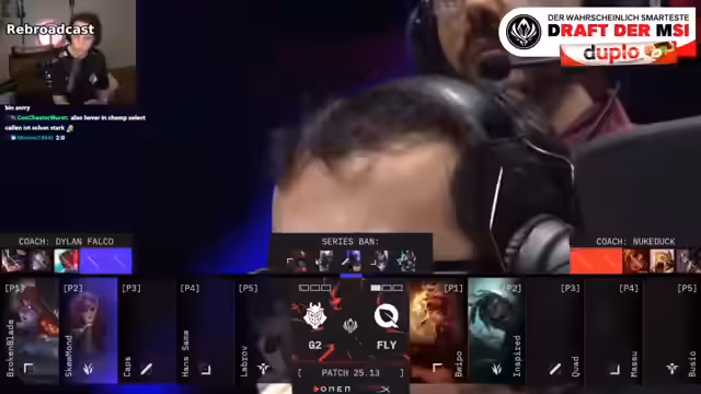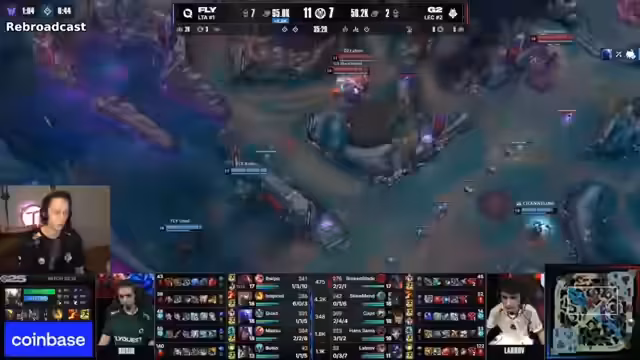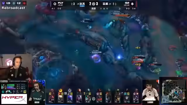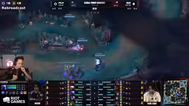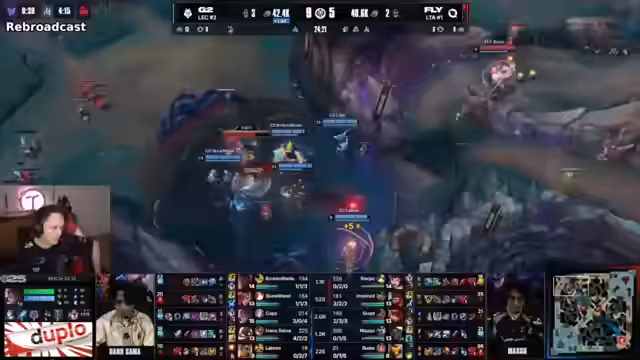 00:38:20Das Spiel schreitet ins Midgame voran. G2 erobert den Ocean Drachen, was die Diskussionen um das Schuh-Quest für Cassiopeia befeuert, da sie durch Quest-Abzeichen starken Schaden verursacht. FlyQuest versucht mit ihren Halbglobals von Pantheon und Ryze zu engagieren, wird aber von G2s Frontline mit Maokai und Arthrox aufgehalten. Es kommt zu einem langen, chaotischen Teamfight, bei dem G2 mehrere Gegner eliminiert und einen klaren Vorteil aufbaut. Hans gibt den First Blood an Bippo weiter, was für FlyQuest schmerzhaft ist.