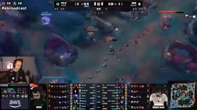 01:47:49Es kommt zu einem extrem chaotischen und großen Teamfight im Nashor-Bereich. Buzio und sein Bard sind weiterhin die treibende Kraft, da er seine Ulti perfekt auf die gegnerische Backline setzt. G2 verliert den Fight, was direkt zum Verlust des Nashors führt. Kritisiert wird, dass Hans Sama sich in einer gefährlichen Position engage lässt, was den Verlust unvermeidlich machte. Trotzdem haben beide Teams eine Chance, da der Goldunterschied gering ist, jedoch haben FlyQuest mit der Seele des Windes einen massiven Vorteil.
