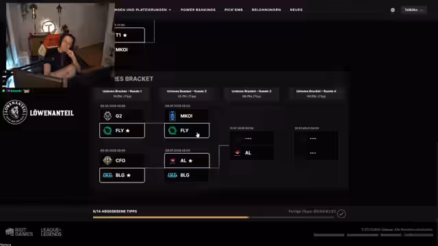 00:33:23Die LoL-Diskussion konzentriert sich auf die anstehenden Matches und die Vorhersage von Siegern. Der Streamer analysiert Matchups wie T1 gegen Gen.G und erklärt, dass T1 historisch gegen Gen.G bei internationalen Turnieren nie verloren hat, was er als Tradition bezeichnet. Bei anderen Paarungen wie Mobistar gegen FlyQuest werden die unterschiedlichen Spielstile (Teamfighting) verglichen, wobei der europäische Bias eine Rolle spielt. Letztendlich werden Vorhersagen für verschiedene Spiele getroffen, wobei analytische Überlegungen und persönliche Vorlieben einfließen.