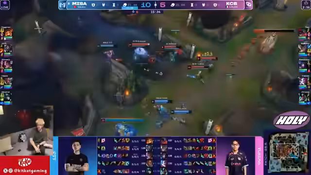 00:36:40Misa dominiert das Spiel und hält alle Türme. Pantheon ist der herausragende Spieler, der mit seiner Ultimativfähigkeit und seinen schnellen Geldeinnahmen durch die Quest einen enormen Vorteil schafft. Dies führt zu einem "Stomp", in dem Misa kaum Fehler macht. Der Gegner, KCOP Blue, kann kaum etwas entgegensetzen, da nur Yukino überhaupt etwas tut und versucht, sein Team zu leiten.