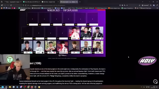 00:29:22Der Streamer kommentiert die Teamdynamik und die Entscheidungen der Mitspieler, insbesondere die von Aurora, die er als Troll bezeichnet. Er betont die Notwendigkeit, zu basen, wenn man so viel bekommt. Er erklärt, dass er ein bisschen weiter reinlaufen wird, sodass er genockert wird. Er lobt seine Botlane für ihre Stärke, die vor allem dank der Plays von Talia und ihm zustande kommt. Er stellt fest, dass das Spiel in einem wundervollen Spot ist. Er spricht über das Canceln von Auto-Attacks und das Time-Argatieren. Er klaut noch den Wrappauf. Er kauft sich drei wundervolle rote Items: Schuhe, Pink Wards, Sweeper und Storx Gage. Er erklärt, dass er den Gegner solo killen konnte, weil er auf dem alten Power Strike verkackt hat. Er erklärt, dass er zwei Leute honoren wird, während er die toxischen Spieler reported. Er gibt Tipps, wie man gegen Blitzcrank Invades spielt. Er ist sehr zufrieden mit seinem Spiel und findet, dass er ziemlich gut gespielt hat. Er erklärt, dass er sehr Turret-fokussiert ist. Er schützt den Laboraffen vor einer Infektion. Er sagt, dass er keine einzige Sekunde des neuen Taylor Swift Albums reingehört hat. Er erklärt, dass Nico der einzige Champion ist, der in allen fünf Rollen gespielt wurde mit Erfolg bis Master Plus. Er erklärt, dass er privat die ganze Zeit nur Worlds hört. Er sagt, dass er sich komplett selbst foltert, weil er so hyped ist. Er sagt, dass er in drei Jahren wahrscheinlich wieder in Europa sein wird. Er glaubt, dass Kiana-Jungle broken ist. Er sagt, dass von den drei Champions, die er spielt, Volibear der Beste für seine Elober ist. Er erklärt, dass die Play-In-State ein bisschen kürzer ist, der Rest ist so wie die letzten paar Jahre. Er sagt, dass Mel sehr schwach in Höheren Elos ist. Er sagt, dass LeBlanc hoch und runter gespielt wird beim Asia Invitational von Showmaker und Co. Er sagt, dass er ein bisschen mehr Toplane spielen wird, um ein bisschen besser zu spielen.