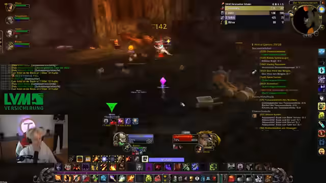 02:37:21Die Gruppe beschließt, eine 'Kette' zu geben, da sie runterspringen wollen. Der Streamer möchte die Aktion unten machen, um 'Fall Damage' zu vermeiden. Er hat lange gewartet und hatte Angst zu sterben. Die Mobs bewegen sich wieder und von links kommt Gefahr. Der Streamer will den 'Wichtel' neu beschwören. Er fühlt sich lebendig, aber ab jetzt wird es gefährlich.