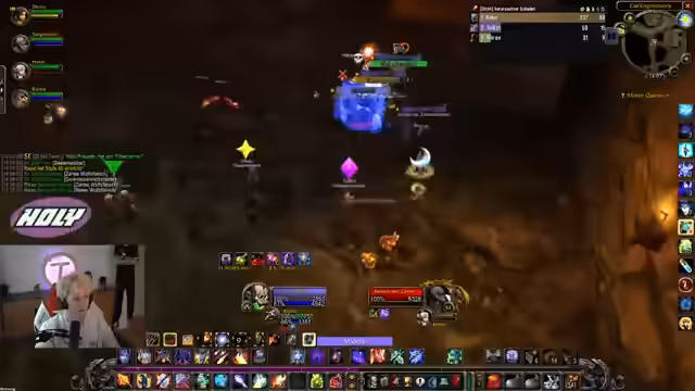 02:48:19Die Gruppe beschließt, CC-Fallen zu nutzen. Ein Spieler 'pullt' mit 'Zapp'. Es wird ein Bug erwähnt, bei dem die Mobs nicht von der Falle gelenkt werden. Der Streamer gibt zu, dass seine Schuld war, da er nicht wusste, dass die Mobs die Türen ignorieren. Die Gruppe macht trotzdem weiter, aber es ist 'bisschen angespannt'. Ein Krieger ist 'verbuggt' und wechselt seine Position.