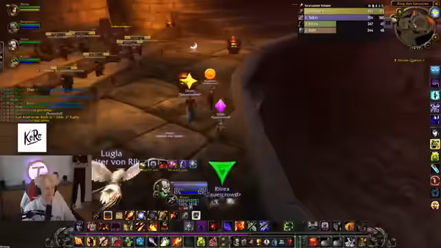 02:52:26Ein 'Wichter' findet den Weg nicht zur Tür. Die Tür ist 'verbockt'. Die Gruppe wartet und zieht die letzten Mobs nach hinten. Es wird eine CC-Falle gemacht. Ein Spieler möchte den 'Offizier' 'zapen', aber der erste Mob ist nicht mitgesappt. Der Streamer zieht sich zurück. Die Gruppe ist 'durchgekommen', aber es ist ein 'langer Run' gewesen.