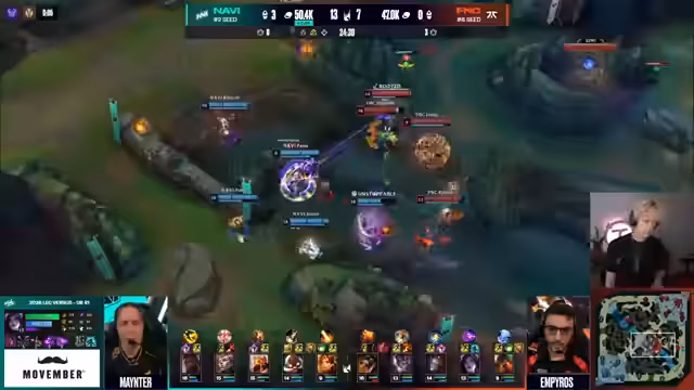 03:17:52Rilek setzt seine beeindruckende Performance fort und agiert als der unbestrittene Mittelpunkt von Navis Spielweise. Er nimmt permanent Kills und Vorteile weg, während Fnatic ohne Flash und mit schlechten Positionierungen hilflos wirkt. Trotzdem kämpft Fnatic mit Kampfgeist um einige Bounties, kann aber den Drachenkontroll und den Goldvorsprung von Navi nicht ernsthaft gefährden.
