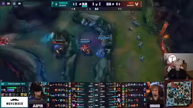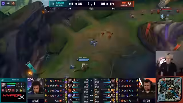 05:04:36Ein massiver Teamfight entbrennt, nachdem Mervyn einen aggressiven Fehler macht, der ihm teure Platten kostet. Vitality nutzt diese Schwäche, um einen Drachen zu sichern. Jojo rettet Mervyn durch einen Trade und stirbt dabei. Der Kampf endet trotz eines gewonnenen Teamfights für Movistar im Verlust des Drachen, was für Vitality einen entscheidenden Vorteil bedeutet.
