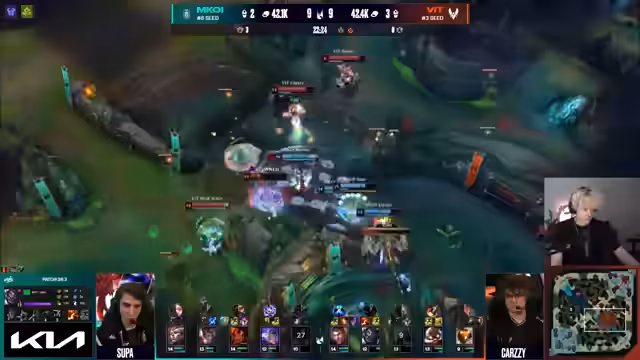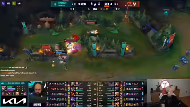 06:00:23Das Spiel erreicht eine historische Länge und wird längstes Game der Regular Season in Europa. Spielerleistungen sind außergewöhnlich, wie ein 1-vs-1 Fight zwischen Kasi und Corki, bei dem Corki angeflasht und 7000 Gold zurückliegt. Trotzdem spielen beide Teams voll aus und nutzen jede Ressource. Vitality zeigt strategische Klugkeit, indem sie den achten Drachen fallen lassen, um alle Wellen zur Base zu pushen, den Druck auf Movistar massiv zu erhöhen.