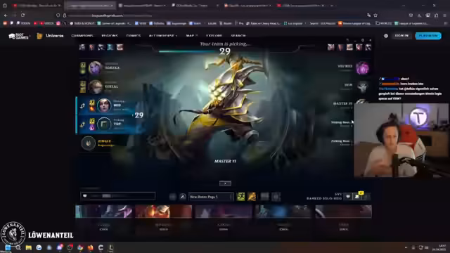 06:17:48Der Streamer kündigt eine 'Challenge' für die kommende Woche an, die 'Master of Ionia' genannt wird und mit der 'Ionia Season' beginnen wird. Dabei soll ausschließlich mit Champions aus der Ionia-Region gespielt werden, wofür er bereits Übungsspiele mit Master Yi plant. Er ist motiviert von der Aussicht auf neues Content-Projekt und die Gelegenheit, alternative Champions zu spielen, was ihm Abwechslung von seiner üblichen Top-Lane-Rolle verspricht. Diese Ankündigung signalisiert einen positiven Ausblick trotz der vorangegangenen挫折.