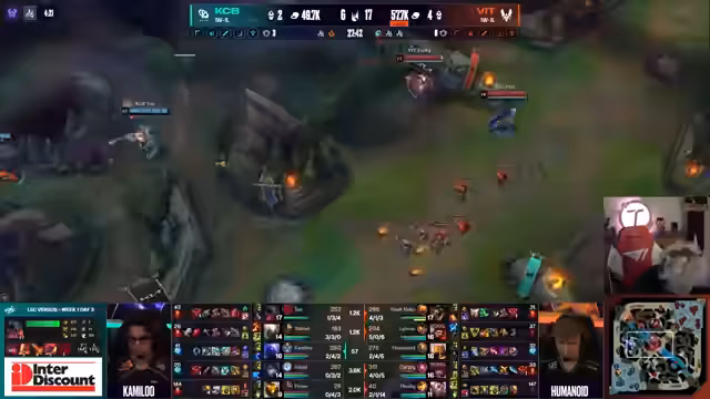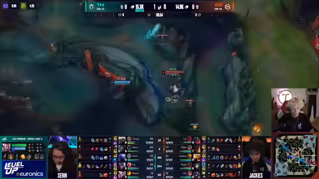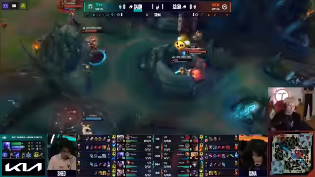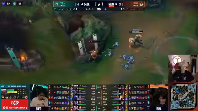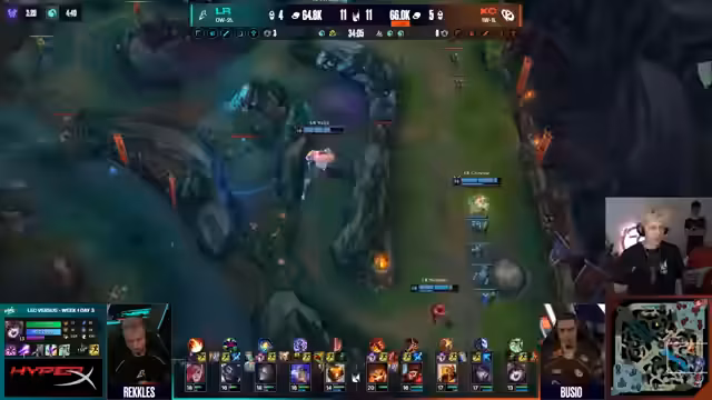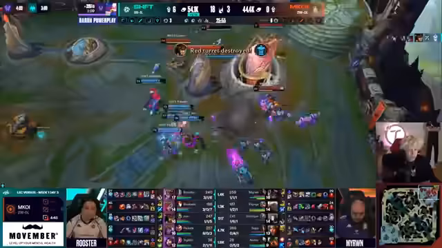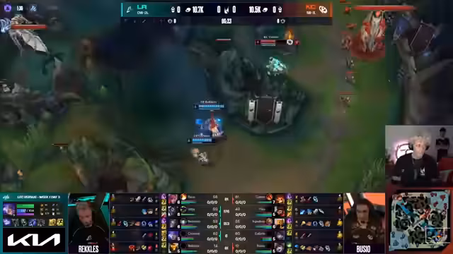 06:20:11Beim Kampf um den ersten Drachen macht das Jungler-Duo von Los Ratones, Mundo und Raktus, einen strategischen Fehler. Anstatt gemeinsam den Draken zu kontrollieren, teilen sie sich die Ressourcen, indem Mundo den Blue Buff invade und Raktus zum Draken geht. Dies führt dazu, dass K-Corp den Draken sicher kontrollieren kann. Später, im Teamfight, können die Ratten der DPS-Burst von Orianna, Aphelios und Nah nicht standhalten und verlieren mehrere Teammitglieder. Mundo erweist sich als ungeeignet gegen viele Champions mit hohen Schadensausstoß.