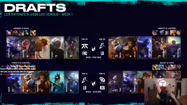 05:39:36Der Kommentator analysiert den Draft von Los Ratones und lobt den Mut, Meta-Champions zu spielen, anstatt nur auf zwei Spiele zu setzen. Er hebt die hohe Schadenszahl von Baos auf Top-Lane hervor und kritisiert Reckless' Performance auf Support, insbesondere mit Braum, die als zu passiv und wenig für das Team einbringend bewertet wird. Die Verantwortung liege primär bei Velja, der Unterstützung von Nemesis und anderen Spielern brauche. Es wird die Frage aufgeworfen, ob das Team nach dem laufenden Split aufgelöst wird, da die Kommunikation dazu bisher uneindeutig war.