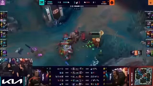 01:50:07Im Mittelspiel des zweiten Spiels gerät G2 in große Schwierigkeiten. Ein unbedachter Engage von Caps führt zu dessen Tod, woraufhin G2s gesamtes Team den Kampf verliert und zwei wichtige Spieler verliert. Fnatic nutzt diesen Vorteil, um mehrere Objectives zu kontrollieren und den Goldvorsprung weiter auszubauen. Die commentators kritisieren G2s fehlerhaftes Engagement und den mentalen Zusammenbruch, insbesondere als Caps in einem kritischen Moment tödlich verwundet wird, während er im Shop steht. G2s Champion-Kombination wird als zu anfällig identifiziert und kann dem Druck von Fnatic nicht standhalten.