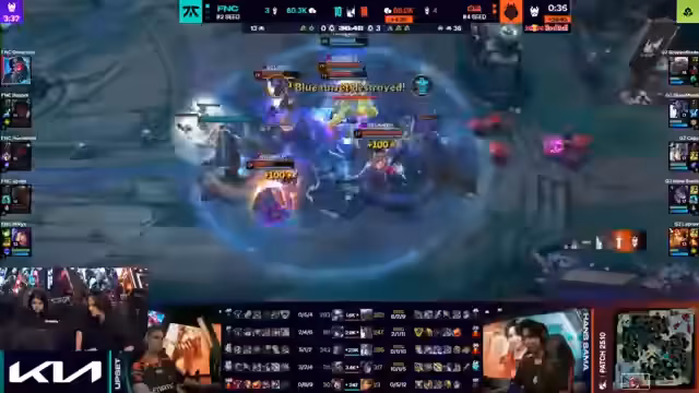 02:49:38FNC positioniert sich nun ideal für einen Nashor-Engagement. Renata Glasc dringt tief vor und könnte als Erster einen Fang gegen Lavrov landen. G2 nutzt die Chance und startet den Fight mit einem gewaltigen Gnar von Broken Blade, der vier Gegner am Ende mit seinem W stunlockt. Humanoid findet kein Opening und steht daneben, weshalb die gesamte Bot-Lane aufgeräumt wird. Trotzdem überlebt Humanoid als Letzter. FNC nutzt den respawnenden Nashor, zieht ihn durch und landet einen perfekten Catch im Teamfight, was ihnen den Sieg sichert.