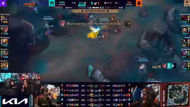 03:46:21Ein entscheidender Teamfight beginnt, bei dem Fnatic initiiert und G2 auf die Angriffe reagiert. Broken Blade entkommt knapp mit seinem Flash, doch Tibbers von Annie tut erheblichen Schaden. Die Gegeninitiative von Fnatic ist erfolgreich: Sie eliminieren mehrere Gegner und gewinnen den Fight knapp. Trotzdem bleibt es ein sehr knappes Spiel mit minimalem Goldvorsprung für Fnatic. Die Spannung steigt, da beide Teams versuchen, die Kontrolle über das Spiel durch Map-Objektive wie den Drachen zu sichern.