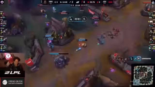 05:30:19Das Spiel erreicht einen Höhepunkt mit einem Base Race, bei dem Pages Mitte durchrennt. JDG gewinnt das erste Best-of-Five in der Hauptregion durch einen Frontdoor-Angriff mit Pantheon und Jhin. OMG musste auf Hayme gehen, da sie nicht auf die Seele warten konnten, bis alle respawnt sind. Der Streamer bezeichnet das Ende als "fucking wild und absolute Cinema". JDG gewinnt damit erfolgreich drei Spiele und OMG verliert trotz eines "crazy Gameplay" mit 0-2. Der Streamer erwähnt, dass OMG in der zweiten Serie gefährlicher wirkte und noch Chancen auf die Playoffs hat. Er erinnert an die bevorstehende Neujahrspause in China und spekuliert, wie die Teams die Feiertage nutzen werden. Abschließend lobt er das "geile Game" und die "geile Series" mit vielen verrückten Matchups und hebt die Leistung von Pantheon hervor.