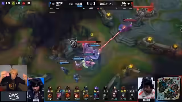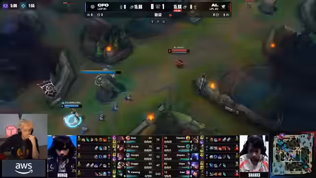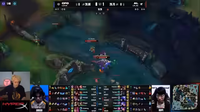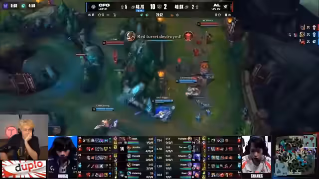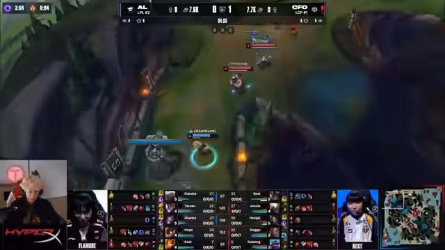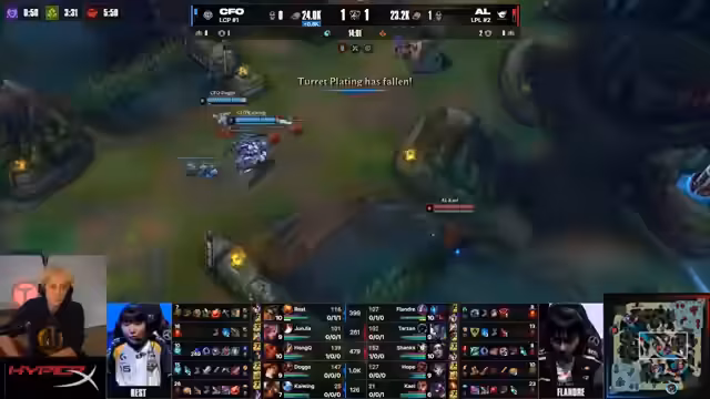 04:53:32Rek'Sai stirbt nicht, obwohl sie zu tanky ist, um zu sterben, und heilt sich mit ihrer Passiven hoch. Flandre lebt und erzielt einen wichtigen Kill für CFO, die das Viertelfinale nicht verschenken wollen. Das Spiel ist von viel Trading geprägt, Bot-Lane gegen Top-Lane, und der Drache wird für einen Kill auf der Top-Side geopfert. Das Gold bleibt ausgeglichen. Shanks zeigt seine Raven-Bond-LeBlanc. Es wäre ein großer Erfolg für CFO, wenn sie gewinnen könnten, da es zehn Jahre her ist, dass Taiwan das letzte Mal das Viertelfinale erreicht hat. Um dies zu erreichen, benötigen sie diesen Sieg, die Drachen und vor allem den Harold, da der Mid-Turm extrem relevant ist, um das Spiel ins Chaos zu stürzen, was für Champions wie Thalia Vi und LeBlanc wichtig ist. Beide Seiten werden um den Harold kämpfen. Alle Spieler kaufen ihre Items und sind bereit für den entscheidenden Teamfight um das Viertelfinale. Mr. Hongkyu hat noch nicht sein Seraph's Embrace fertig, was schmerzhaft ist, aber er muss um den Harold kämpfen, da es keine andere Option gibt.