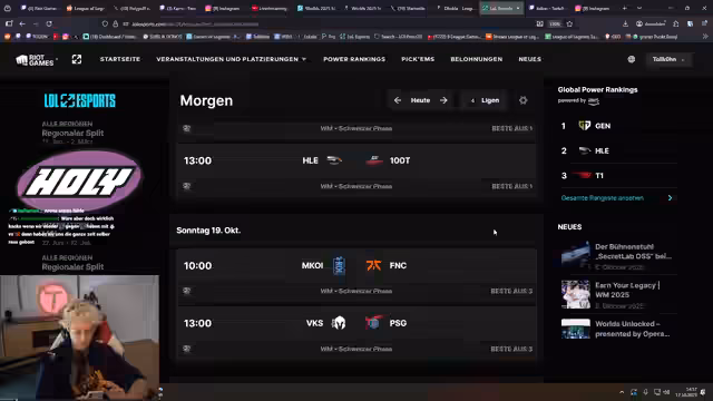 10:07:00Die aktuelle Situation der Teams wird analysiert, wobei viele starke Teams, darunter der amtierende Weltmeister T1, der MSI-Champion Gen.G, Hanwha Life, G2 und FlyQuest, mit einem 1-1-Rekord dastehen. Dies deutet auf einen sehr spannenden morgigen Spieltag hin, insbesondere das koreanische Duell zwischen Gen.G und T1. Auch G2 gegen BLG wird mit Spannung erwartet, da G2 in der Swiss Stage bisher jedes Jahr gegen BLG verloren hat. Es wird die Hoffnung geäußert, dass G2 dieses Jahr den Fluch brechen kann. Die Strategie für G2, um ins Viertelfinale zu kommen, wird mit einem Yu-Gi-Oh!-Vergleich beschrieben, bei dem Movistar und Fnatic geopfert werden müssen, um G2 zum Sieg zu verhelfen. Es wird jedoch betont, dass dies erst morgen relevant wird, wenn die europäischen Teams spielen.