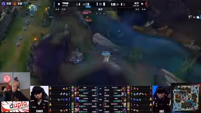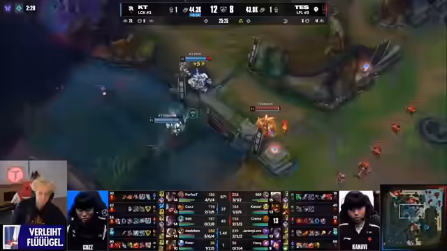 08:45:50Ein Sideline-Gank wäre ideal für beide Jungler. Wukong versucht, Annie zu belagern, was aufgrund ihrer drei Dashes gegen Jarvan schwieriger ist. Kanavi, der Starspieler von JDG und bester Jungler 2023, zeigt eine beeindruckende Leistung, indem er Goobies, Drakes und Kills sichert und somit maßgeblich am Erfolg seines Teams beteiligt ist. Trotz Kanavis Präsenz und der gewonnenen Ressourcen ist das Early Game von Top E-Sports nicht so dominant wie in früheren Spielen gegen Hana Thieves oder G2, was KT eine bessere Ausgangslage verschafft. Besonders die Toplane-Matchups sind entscheidend, wobei Aurora im Laning-Matchup immer stärker wird, sobald sie ihr 'Spear of Frozen Chosen' Item hat. Sie hat bisher keine Pots benutzt, was ihre Dominanz unterstreicht. Die Diskussion über Team-Starts und Ausscheiden wird kurz angeschnitten, wobei ein 2-0 Start noch nie zum Ausscheiden geführt hat. Ein Teamfight auf der Botlane führt zu einem Cross-Swap, bei dem BDD fast stirbt, aber durch eine Barriere überlebt. KT verliert jedoch den Cross-Swap, was Top E-Sports einen Vorteil verschafft, da sie den gesamten Bottom-Turm erhalten, ohne Flash zu investieren, während KT den Mid-Turm sichert.