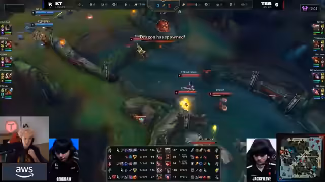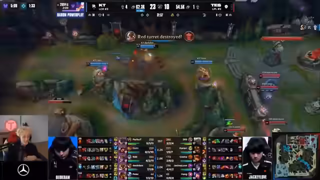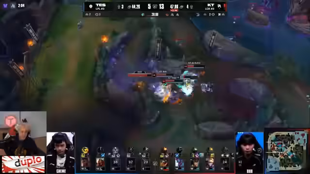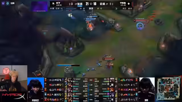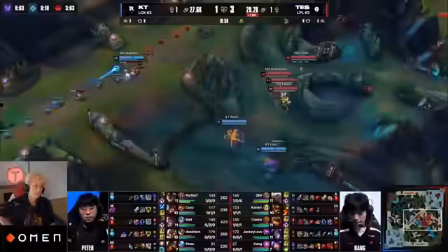 09:45:02Im Mid-Game kämpften beide Teams um Atakan, wobei KT Rolster mit zwei Items auf Kassiopeia einen klaren Vorteil hatte. Kanavi verschwendete erneut seinen Schatten, und Peter von KT überlebte dank Unbreakable. Renekton zwang Jacky Love zum Cleanse, und Cream wurde von Medusas Blick versteinert. Der entscheidende Fehler von Top E-Sports war, dass K'Sante im Split-Push auf der Top-Lane war, während der Rest des Teams im Teamfight kämpfte. Dies führte dazu, dass KT Rolster Atakan kampflos erhielt und ihre Dominanz weiter ausbaute. Top E-Sports wirkte komplett desorientiert, was die Kommentatoren überraschte, da sie als viertbestes Team Koreas gegen ein Top-Team aus China spielten. KT Rolster bestrafte jeden Fehler von Top E-Sports und sicherte sich den zweiten Power-Spike für Ezreal, Renekton, Trundle und Kassiopeia. Trotz eines kleinen Comebacks von Top E-Sports durch einen Kill auf Renekton, der die Golddifferenz reduzierte, konnte KT Rolster ihre Führung behaupten und den Drachen sichern, da Ryze und K'Sante weiterhin im Split-Push waren.