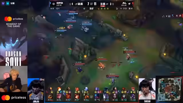 11:25:19Der Kampf um den Herald beginnt, wobei die chinesische Seite ihn sicher auf der blauen Seite startet. Beide Teams verfügen über gute Smite-Fähigkeiten, aber Rumble von der gegnerischen Top-Lane hat keinen Teleport, was ihn daran hindert, rechtzeitig einzugreifen. Dies führt dazu, dass beide Seiten sich vom Herald trennen. Pantheon versucht, auf der Bot-Lane einen Dive zu initiieren, scheitert jedoch, da die Wave nicht vorhanden ist. Dies ermöglicht es der chinesischen Seite, den Herald relativ einfach zu sichern. CFO zieht sich zurück, da ihre Side-Lanes, insbesondere Akali gegen Orianna, Schwierigkeiten haben. Der Verlust des Heralds und des Mid-Turms wird als großer Nachteil für CFO betrachtet, da Orianna mit ihrem Wave-Clear und dem Herald den Mid-Turm leicht zerstören kann. Trotz Lucians Stärke als stärkster Champion im Spiel verliert CFO wichtige Objectives und Gold, was ihren Willen zum Kampf zu mindern scheint. Der anschließende Drachenkampf wird ebenfalls von der chinesischen Seite gewonnen, was ihre Quest vorantreibt und CFO weiter zurückwirft.